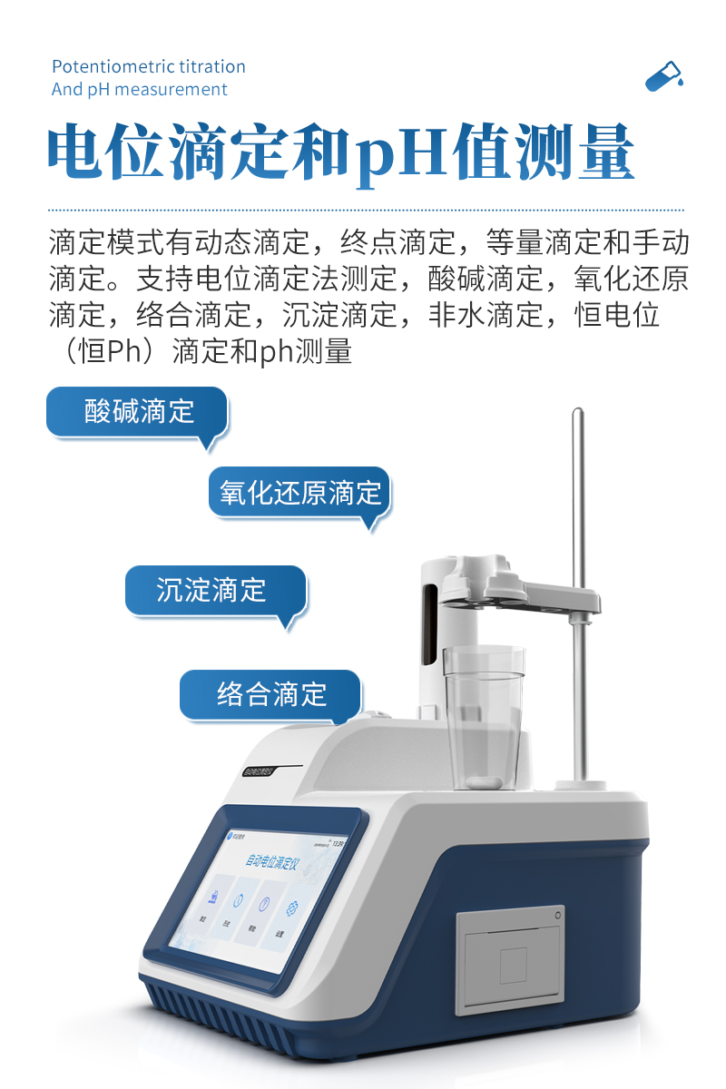1、設(shè)備支持電位滴定和pH值測(cè)量;用戶(hù)選擇不同電極可進(jìn)行酸堿滴定、氧化還原滴定、沉淀滴定、絡(luò)合滴定等多種滴定和pH測(cè)量;