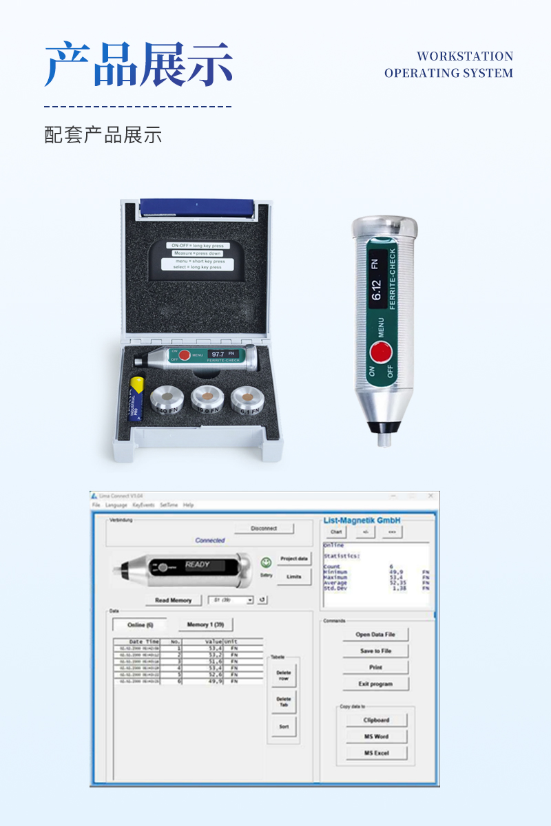 為了進一步處理測量數據,您可以將FERRITE-CHECK 140鐵素體含量檢測儀與移動Android和iOS設備配對。或者與一臺Windows電腦通信。這是由低功耗藍牙技術(BLE)實現的。使用Lima Connect應用程序,您可以管理項目并在照片上分配測量點。測量結果可以統計評估和圖形顯示。這款應用適用于安卓、iOS和Windows系統,軟件免費的。
