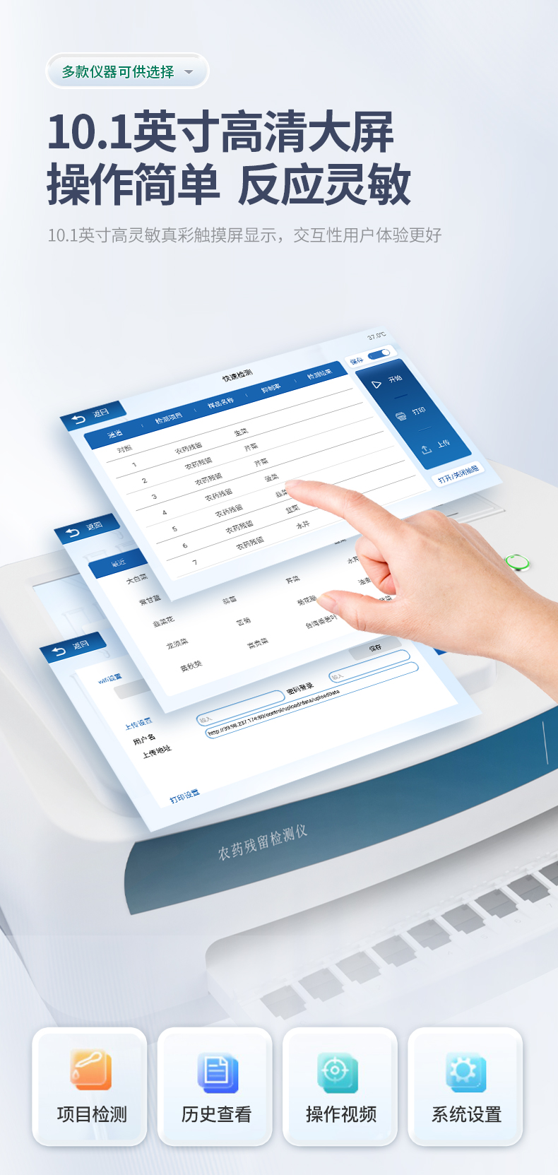 該儀器為三體儀器新研發一款農殘快速檢測儀,采用國標速測卡,使檢測速度更快,操作更加簡便。檢測標準:依據國家標準方法(GB/T5009.199-2003)以及世界衛生組織WHO、世界糧農組織FAO殘留農藥檢測標準、世界環境保護局EPA參照攝入量等要求來設計。