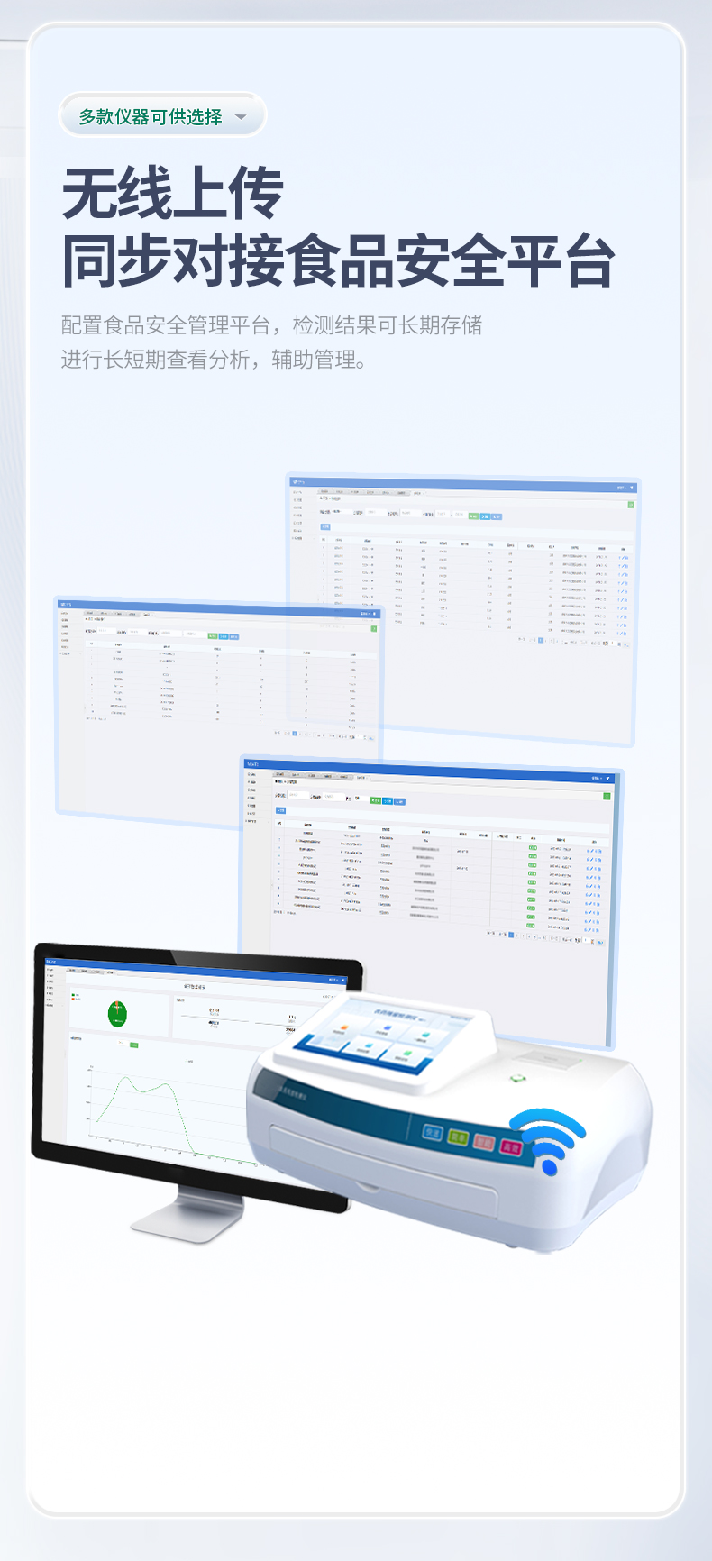6、配置食品安全管理平臺,檢測結果可長期存儲,進行長短期查看分析,輔助管理。
