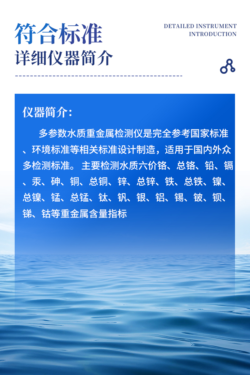 多參數水質重金屬檢測儀是完全參考國家標準、環境標準等相關標準設計制造,適用于國內外眾多檢測標準。 主要檢測水質六價鉻、總鉻、鉛、鎘、汞、砷、銅、總銅、鋅、總鋅、鐵、總鐵、鎳、總鎳、錳、總錳、鈦、釩、銀、鋁、錫、鈹、鋇、銻、鈷等重金屬含量指標;本儀器兼具智能數據分析功能,圖表、列表顯示數據,分析一目了然;高清晰度彩色液晶觸摸顯示屏,Android智能操作系統,中文顯示界面,中英文鍵盤,人性化操作,使用更簡單。